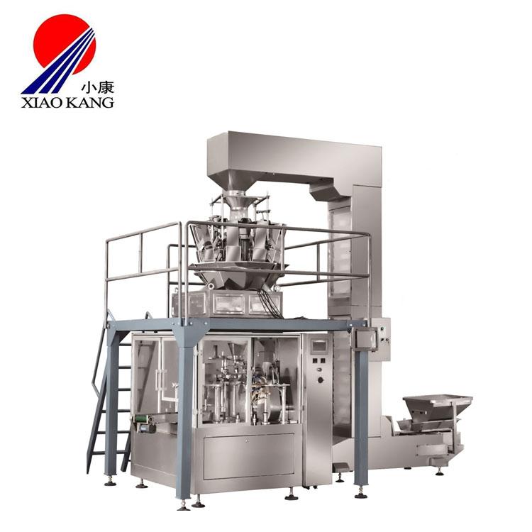 給袋式真空包裝機能夠通過提升機將產品輸送到螺桿定量投料機,保證投料機料倉有足夠物料;然后投料機螺桿把產品壓入定量量杯之中;接著量杯壓入物料后由動靜切刀將多余物料、切斷及分離并輸送到投料口待投料;最后給袋式包裝機上袋進行打碼、開袋、投料機投料、灌液、整形、抽真空、熱封,最后得到成品。